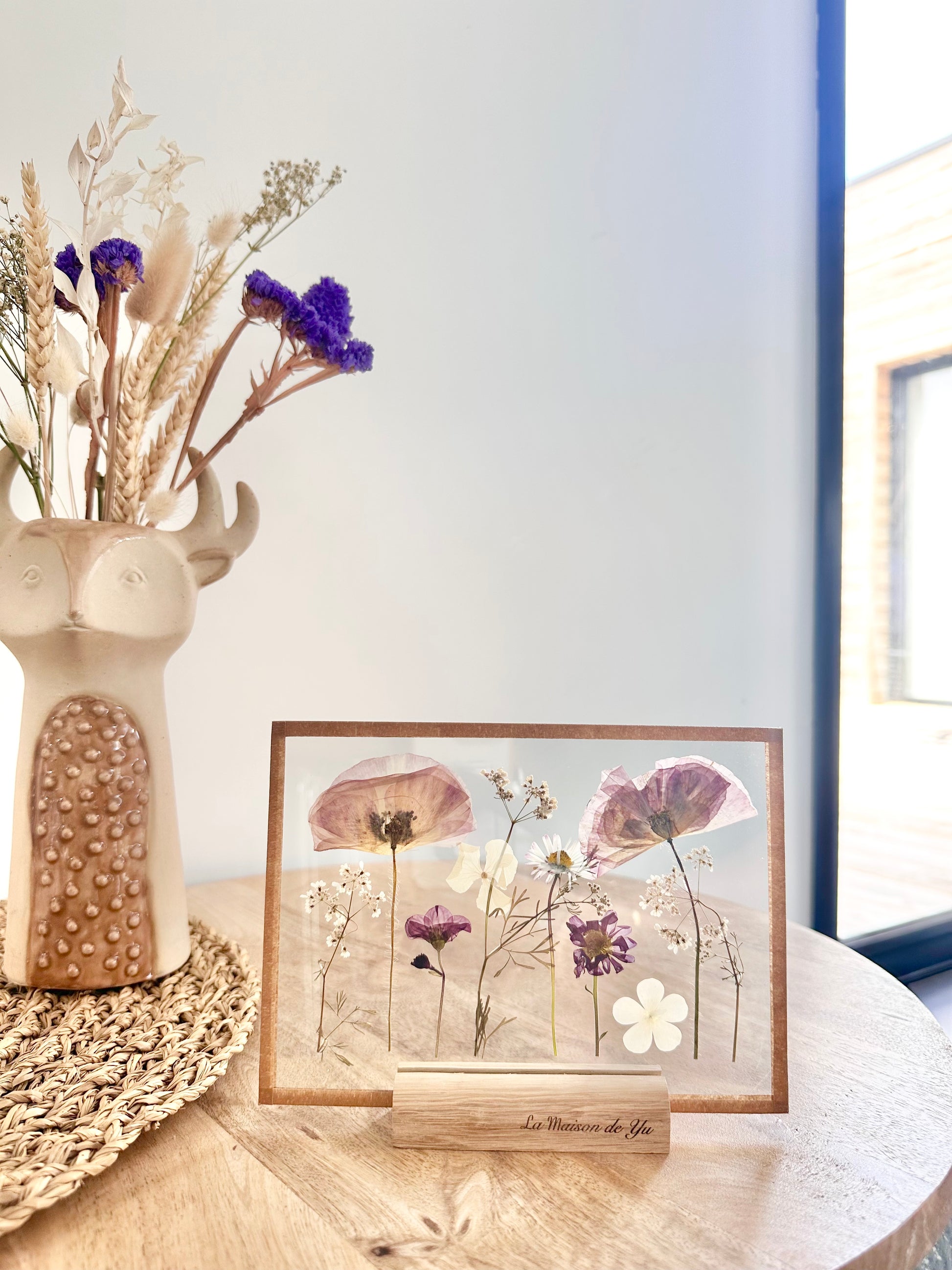 Objet de décoration minimaliste avec de véritables fleurs séchées cultivées dans notre jardin en Normandie. Le socle en bois est fabriqué dans notre atelier.