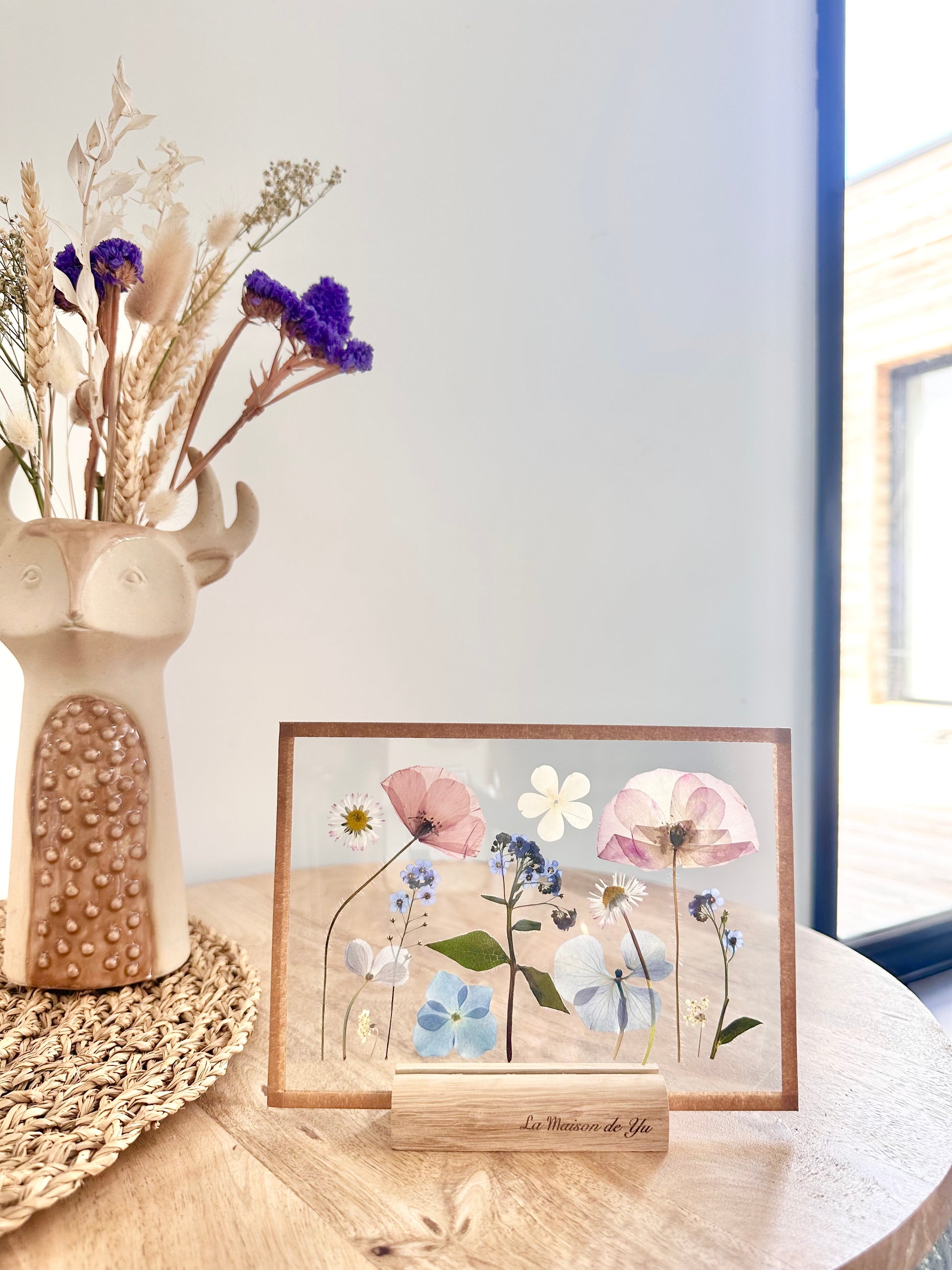 Objet de décoration minimaliste avec de véritables fleurs séchées cultivées dans notre jardin en Normandie. Le socle en bois est fabriqué dans notre atelier.