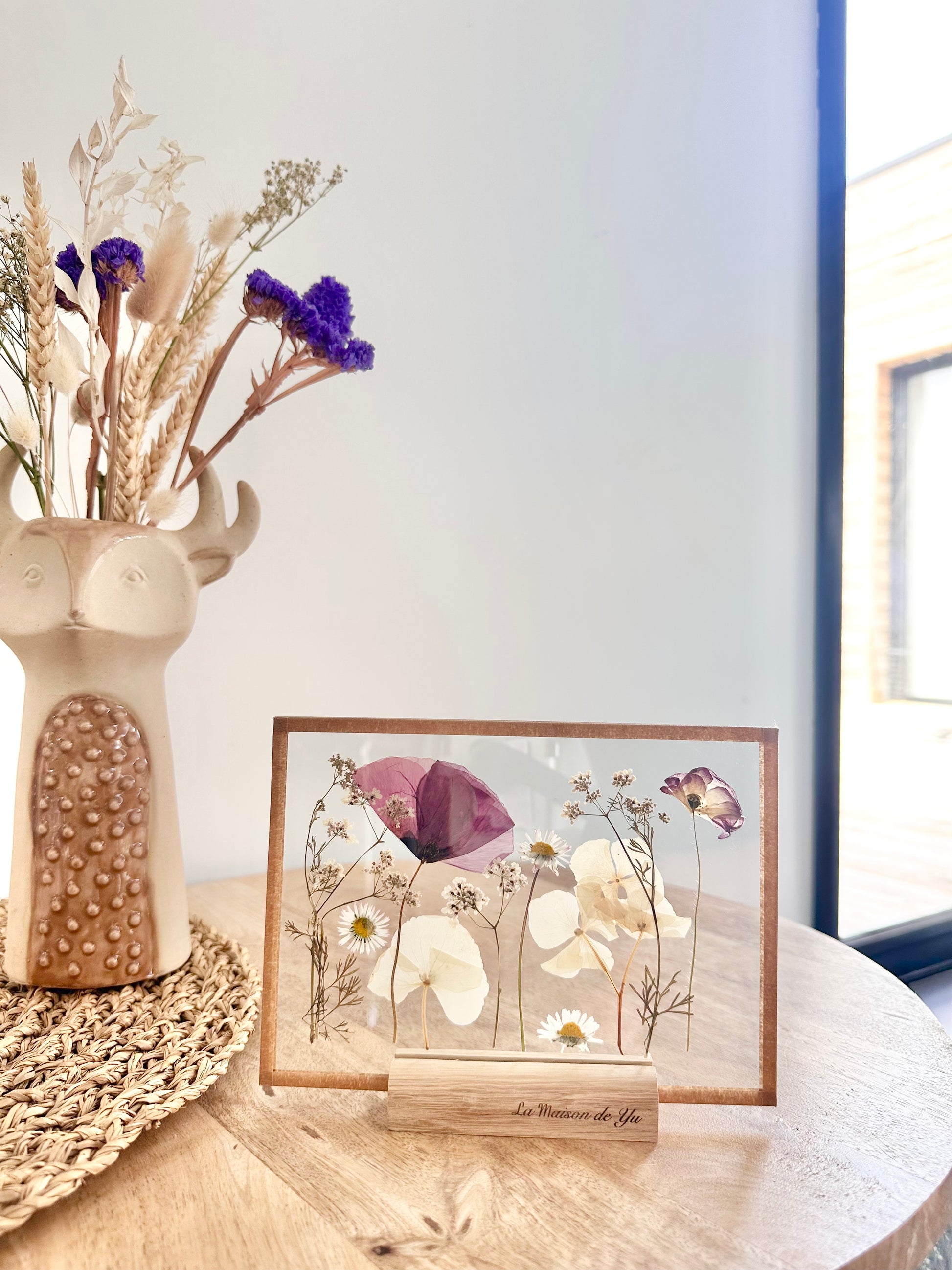 Objet de décoration minimaliste avec de véritables fleurs séchées cultivées dans notre jardin en Normandie. Le socle en bois est fabriqué dans notre atelier.