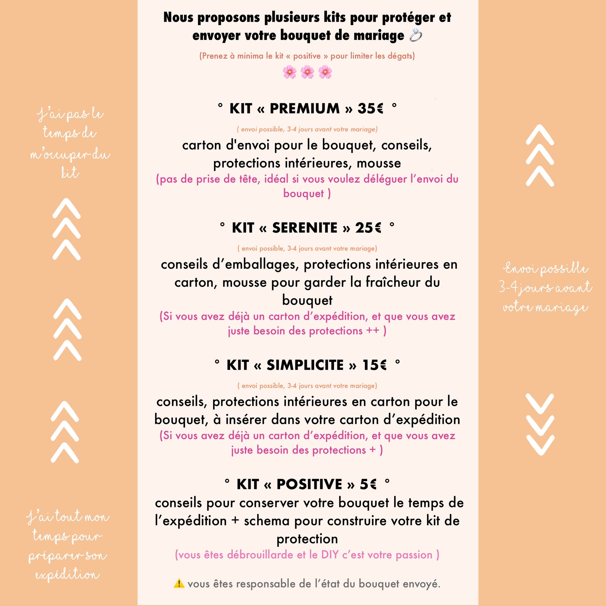 - option sérénité (+25€): conseils d’emballages, protections pour le bouquet, kit de survie. (uniquement avant le mariage).