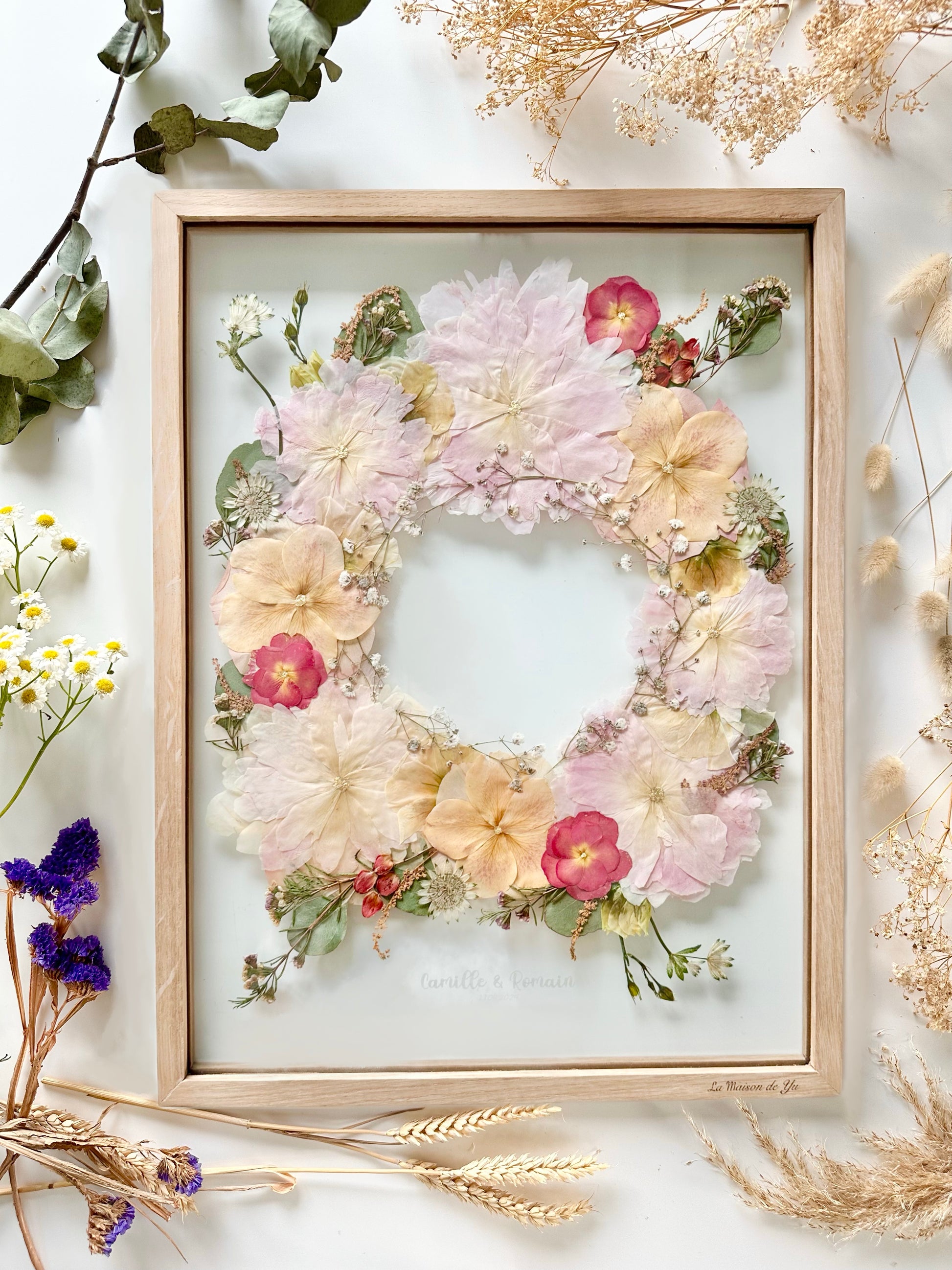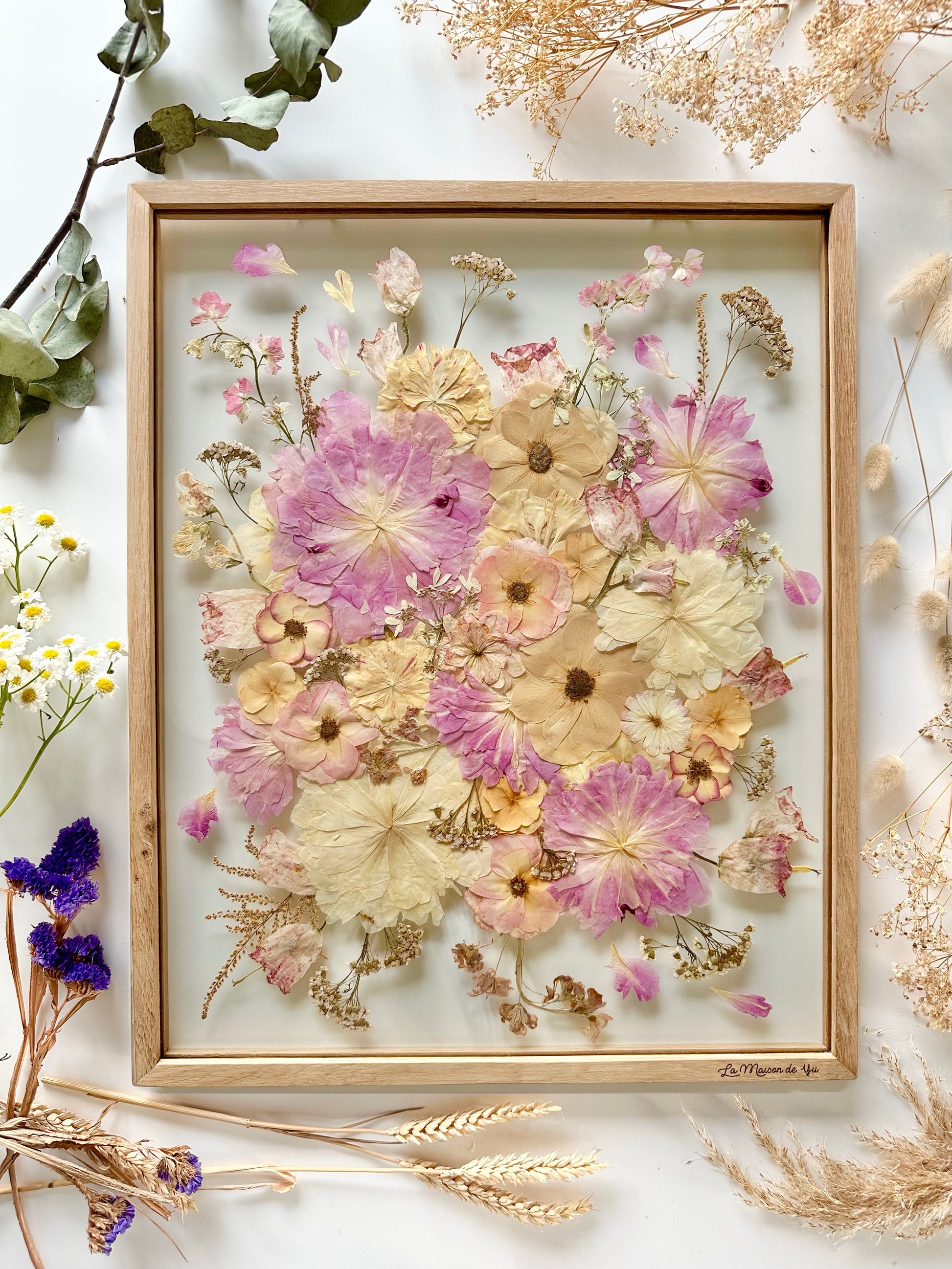 Les fleurs sont séchées sous une presse artisanale avant de glisser dans son encadrement. Dans son écrin vous pouvez choisir le style, les options et son support en bois ( à poser ou à accrocher au mur)