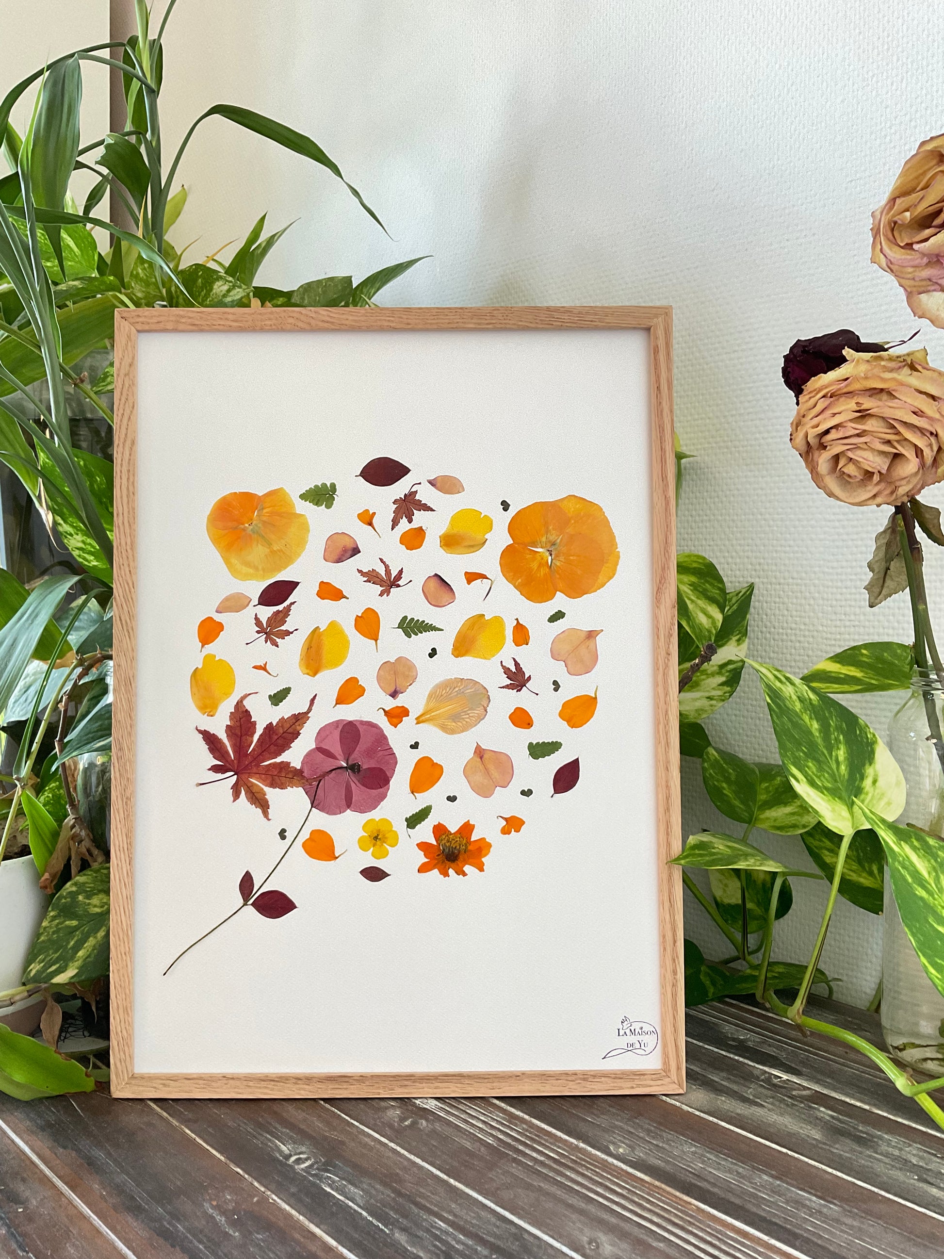 Tableau végétal unique composé de veritable fleurs séchées, idéal pour apporter une touche vintage et moderne à votre intérieur.
