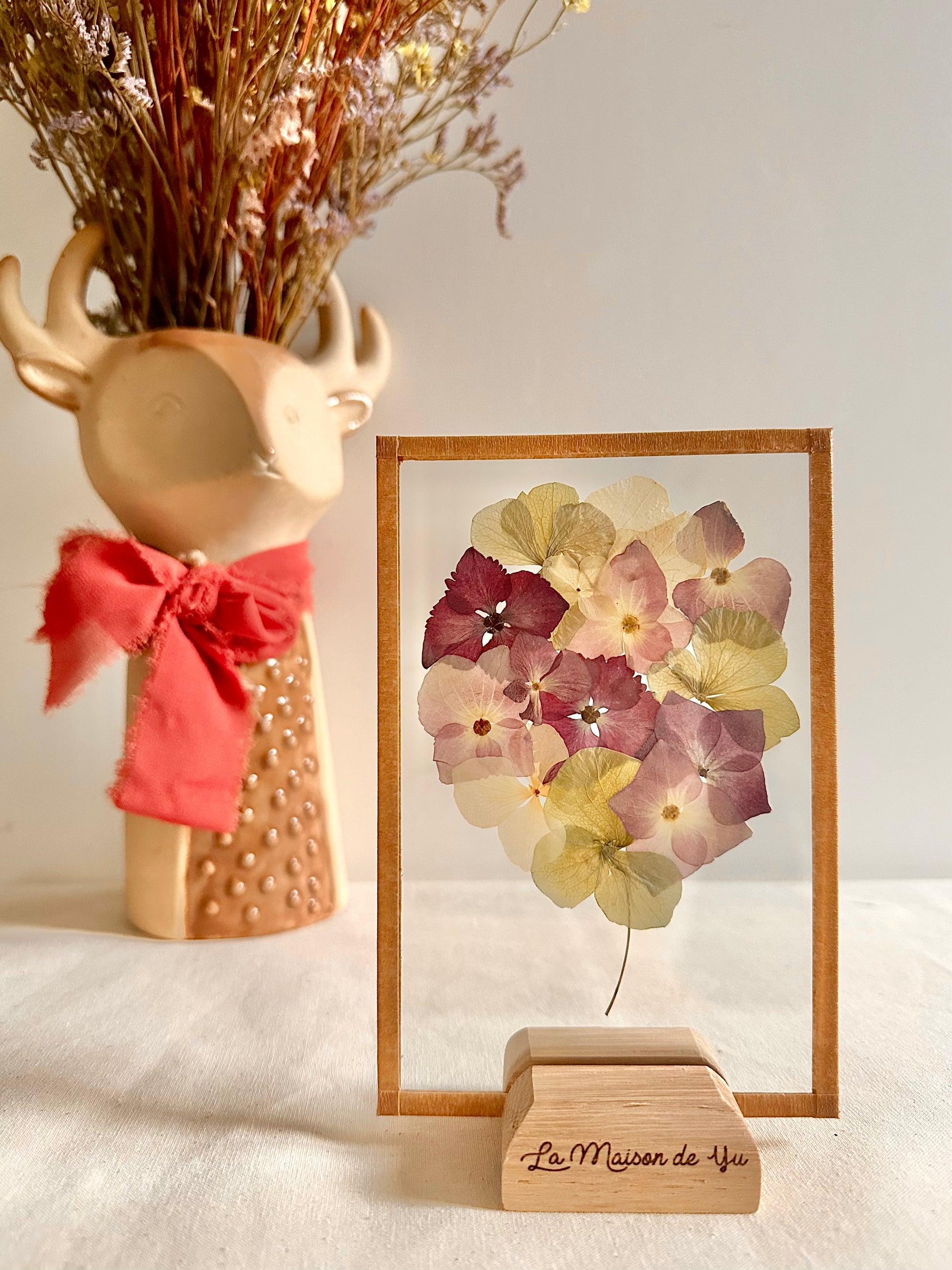 Offrez un bouquet de fleurs qui ne fanera pas ! Les fleurs sont cultivées dans notre jardin en Normandie et le socle en chêne est fabriqué dans notre atelier.