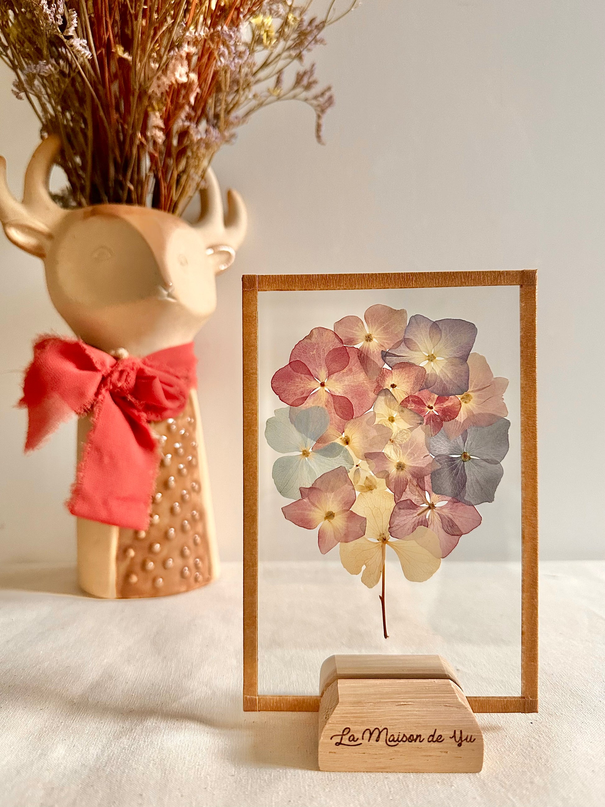 Offrez un bouquet de fleurs qui ne fanera pas ! Les fleurs sont cultivées dans notre jardin en Normandie et le socle en chêne est fabriqué dans notre atelier.