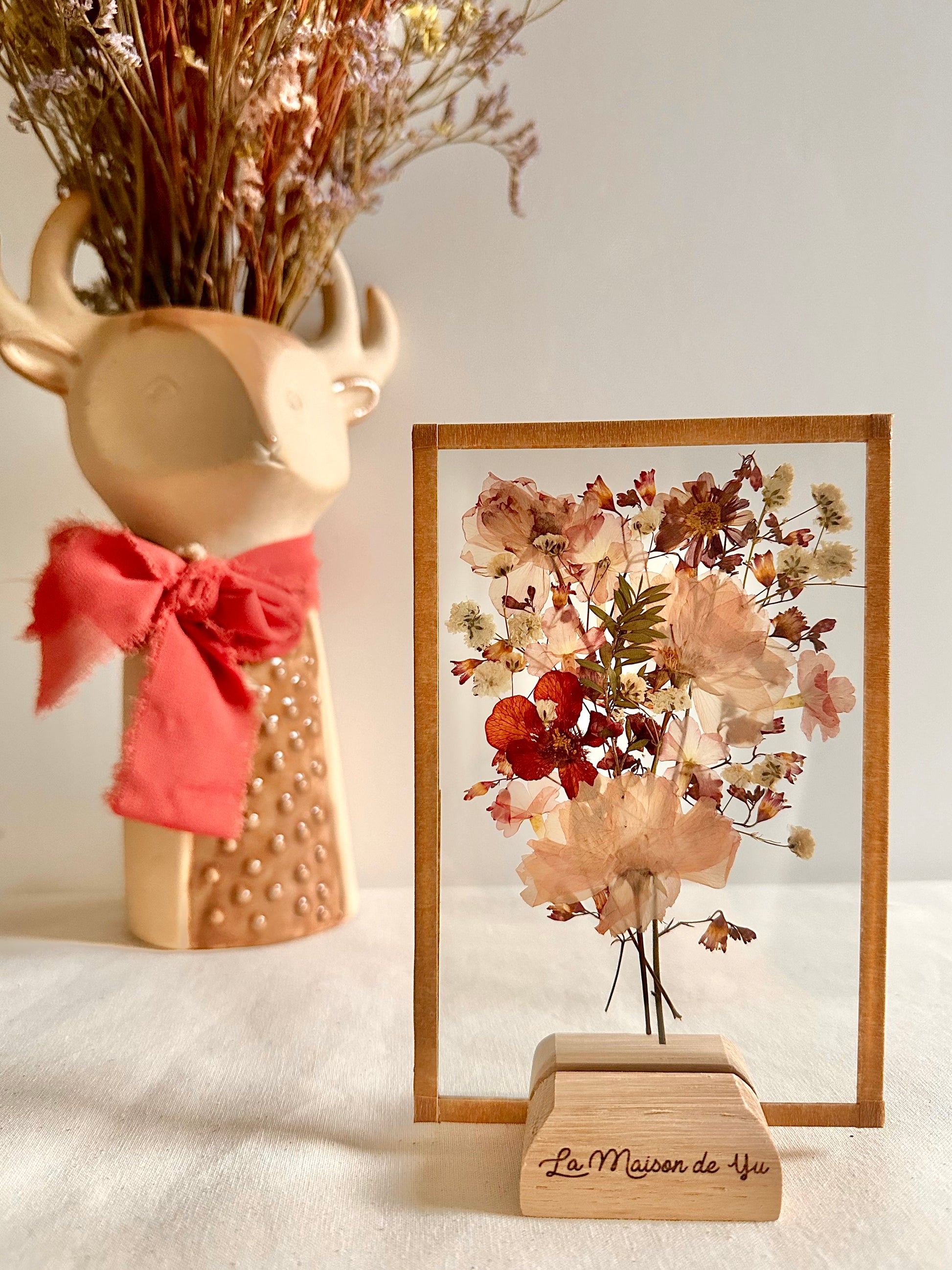 Offrez un bouquet de fleurs qui ne fanera pas ! Les fleurs sont cultivées dans notre jardin en Normandie et le socle en chêne est fabriqué dans notre atelier.