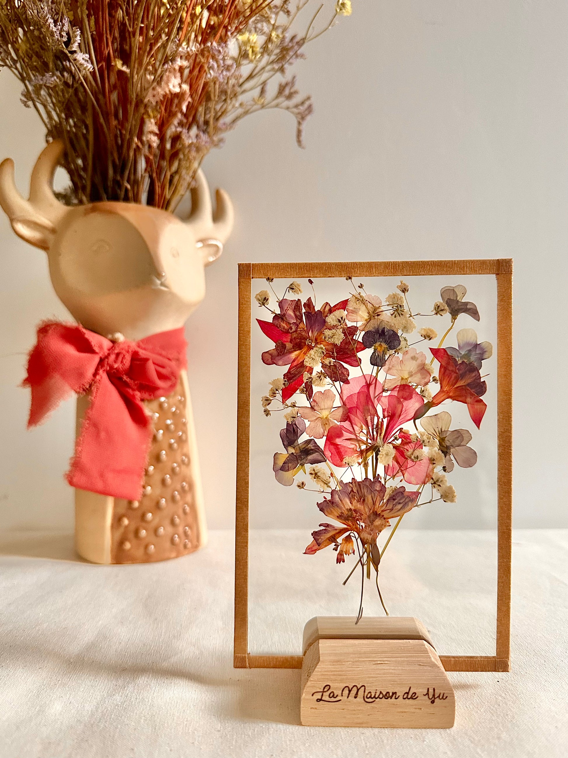 Offrez un bouquet de fleurs qui ne fanera pas ! Les fleurs sont cultivées dans notre jardin en Normandie et le socle en chêne est fabriqué dans notre atelier.