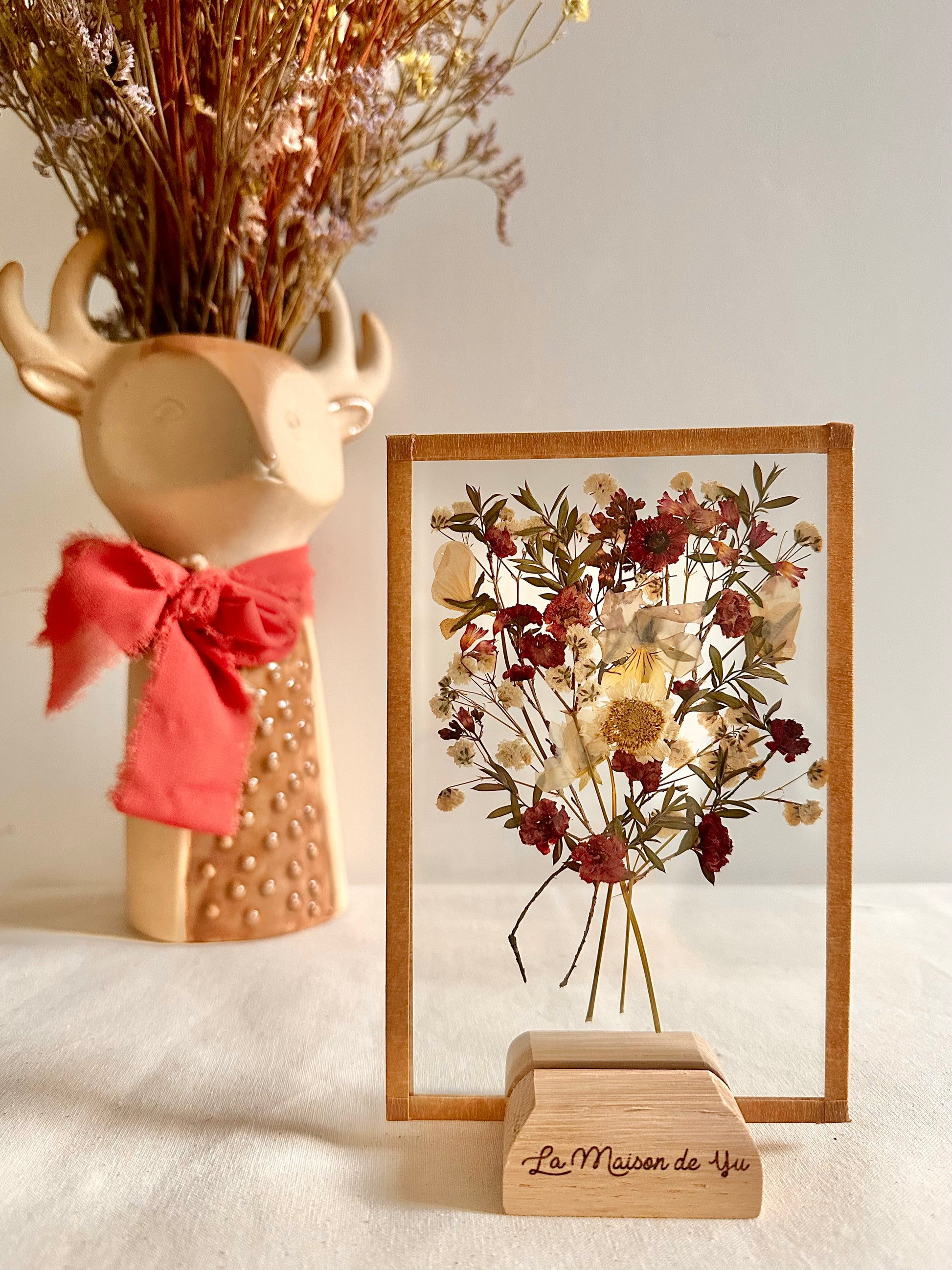 Offrez un bouquet de fleurs qui ne fanera pas ! Les fleurs sont cultivées dans notre jardin en Normandie et le socle en chêne est fabriqué dans notre atelier.
